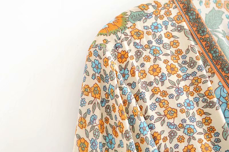 Le motif vibrant de tournesols évoque la nature et la joie de vivre, tandis que la coupe fluide permet une liberté de mouvement idéale pour les activités quotidiennes ou les occasions spéciales. Son col classique et ses manches courtes viennent compléter un look frais, féminin et tendance.